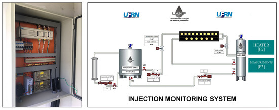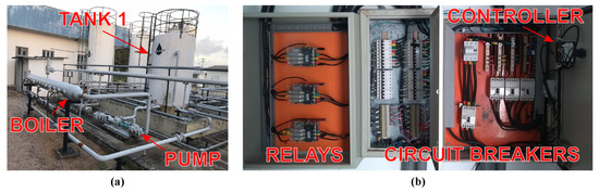 An electric heater was designed and installed to heat the water used in the tests. Figure 6a shows the real structure of the heating system and Figure 6b shows the power supply circuit that controls the heating operation. There is a closed control loop to maintain the tank 1 temperature at the desirable value. This control loop is composed of: a tank, a boiler, and a pump. The power switches, circuitry breakers, and the automatic temperature controller are installed inside the electrical panel.