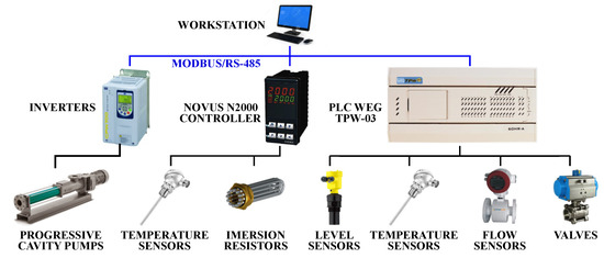 The entire system architecture is shown in Figure 7. Three inverters (model WEG CFW-11) control the pumps rotation and power state. The novus N2000 controller controls the actuators of the heat system and monitors tank 1 temperature with a PT100 sensor. A PLC (programmable logic controller) WEG TPW03 collects information as regards tank levels, flow rates and temperatures of the system, and controls the valves. This equipment is important since it provides the interface between the field components and the workstation.