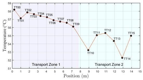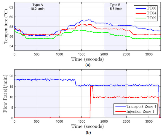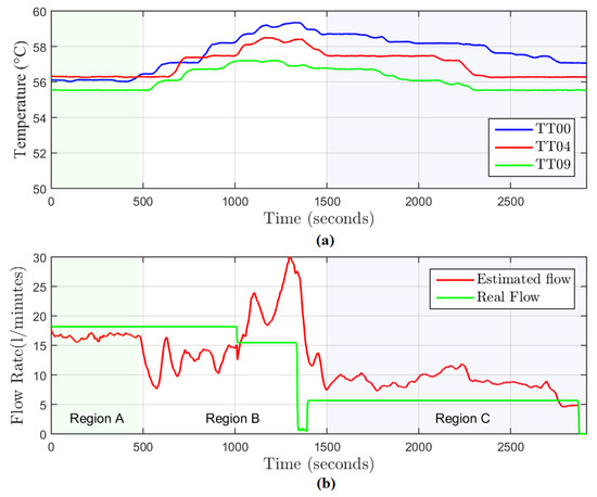 In the first step of the data analysis, it is necessary to define the time intervals to be used for flow rate estimation. Figure 9a shows the graph of temperature with time from the sensors TT00, TT04, and TT09. Figure 9b indicates the real flow rate measured by sensors FT01 and FT02.