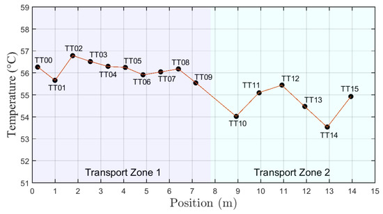 Once the test windows were defined, the following step was used to plot the temperature profiles. The average value for each temperature sensor in the region defined by the test windows were considered. Figure 10 shows the temperature profile along the well column for test A.