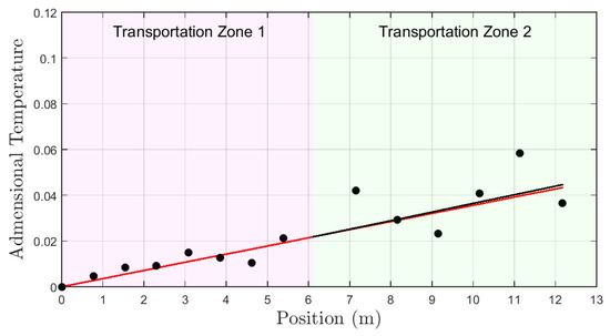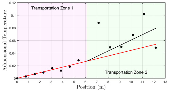 The dimensionless profile for test type A is shown in Figure 12 represented by black dots. The red curve represents a first order approximation by the dimensionless temperatures for transport zone 1. The black curve represents a first order approximation by the dimensionless temperatures for transport zone 2. In this test, the flow rate in transport zone 1 is equal to transport zone 2. The estimated flow in transport zone 2, by the application of the methodology presented in the Section 4 and the comparison with zone 1 was 17.2 L/min. It represents an error of 5.5% related to the real values measured by the sensor in the well inlet.