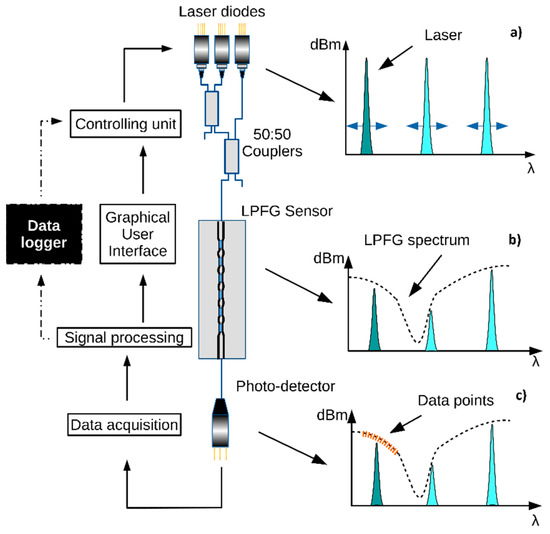 Interrogation methodology description and signal-flow. (a) Laser diodes being thermally swept. (b) Long-period fiber grating (LPFG) spectrum changing the transmitted optical power. (c) Data acquisition by the photo-detector for the laser diode that was turned ON.