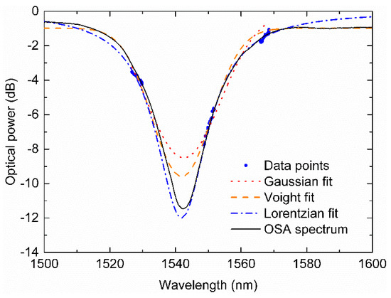 Comparison between several fitting curves for the acquired data points using the developed interrogation unit (IU) and, for validation purposes, the real LPFG spectrum measured by a typical optical spectrum analyzer (OSA) and broadband light sources (BBLS) scheme.