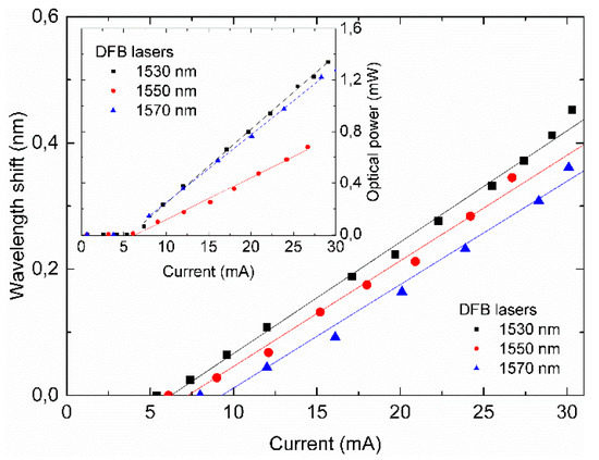 The results for the wavelength and optical power response due to the current sweep are presented in Figure 7. A wavelength shift presents a linear relationship with current [20]. Sensitivity values of 17.2, 16.7, and 16.4 pm/mA were obtained, with R² values of 0.983, 0.989, and 0.987 at the DFB lasers in 1530, 1550, and 1570 nm, respectively. A linear output optical power with respect to the supplied current was also observed above the threshold current of the DFB lasers. The value of these coefficients is not enough to design any major laser tuning for the interrogation unit but enables the use of current as a fine wavelength tuning control.