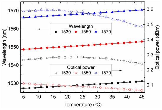 Temperature modulation revealed a linear behavior of 105, 106, and 96 pm/°C, characterized by R² values of 0.998, 0.998, and 0.997, as can be seen in Figure 8. The DFB lasers data-sheet temperature specifications stated maximum ratings from −10 to 85 °C; thus, working below those limits will extend their life-span, and we chose a thermal tuning range from 5 to 45 °C, corresponding to a wavelength range of approximately 4 nm. The measured optical power as a function of temperature was characterized by a second-order polynomial fitting curve with R² values of 0.980, 0.992, and 0.981 [20].