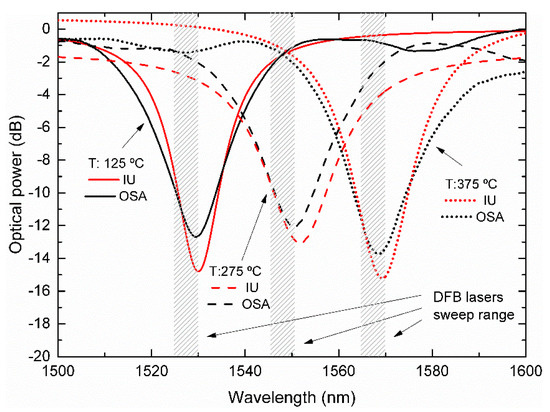 Figure 9 illustrates the LPFG spectra for temperatures of 125 °C, 275 °C, and 375 °C, centered below, on, and above 1550 nm, respectively. The spectral positions of the DFB lasers are also shown. In this case, the overall best fit parameter results had an average R2 value of 0.997 for the complete temperature sweep. This result was obtained with the Lorentzian fit, rather than Gaussian and Voight curves, which presented average R2 values of 0.984 and 0.991, respectively. The comparison between the IU and OSA measurements is presented in Figure 10.