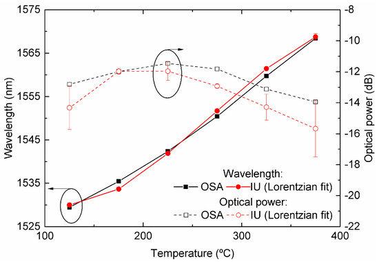 It must be observed that only points between 125 °C and 375 °C, corresponding to wavelength positions inside the range of the DFB lasers (from 1530 nm to 1570 nm) are presented. The error associated with the peak-position determination increases significantly as the peak reaches wavelengths beyond the DFB lasers’ wavelength locations, due to the lack of data points on both sides of the central position of the LPFG attenuation band.