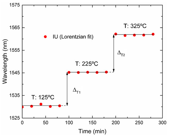 Temperature measurements were made with a LPFG inside a sealed oven (Termolab, Águeda, Portugal), and the temperature was changed in steps of °C from 22 °C to 425 °C, whilst the fiber was maintained in a constant strain state, equal to the conditions upon fabrication.