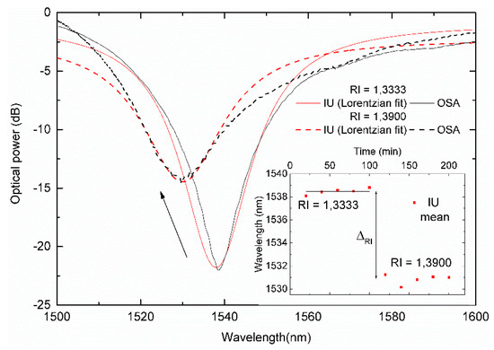 Comparison between the interrogation unit (IU) with a Lorentzian curve fit and the OSA spectra for two refractive index values. The step response is presented in the inset.