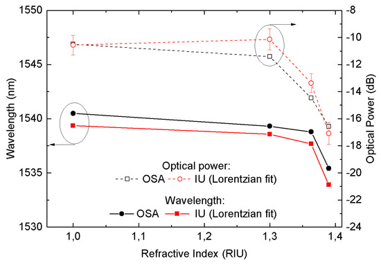 In this case, the overall best fit parameter results were again obtained with a Lorentzian fit. The comparison between the measured wavelength and optical power values are presented in Figure 13. A constant wavelength offset is present, as expected, due to the dip being below the central DFB laser. Nevertheless, the data follow the expected behavior, with both wavelength and optical power shift presenting the maximum values as the external RI approaches the silica RI.