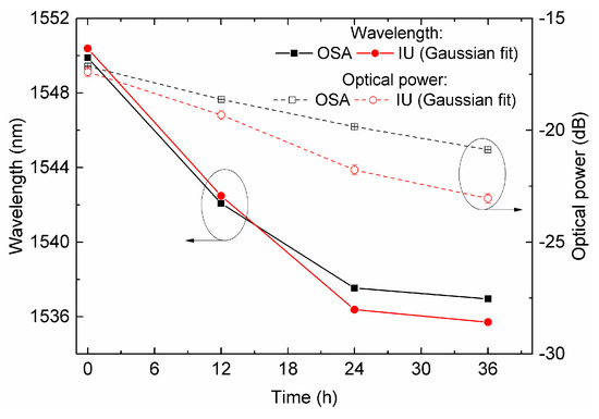 The first measurement revealed values of wavelength and optical power obtained by the IU and measured by the OSA only 0.12 nm and 0.70 dB apart. After 12 h, the grating presented signals of corrosion and the spectral readout revealed a wavelength shift of 8.68 nm and a visibility increase of 1.9 dB. After 24 h, the corrosion shifted the grating peak wavelength and optical power values to 1537.30 nm and 20.17 dB, respectively. After 36 h, the spectra presented a residual increase in optical power of about 0.43 dB, while the wavelength decreased only 0.58 nm, which is expected [19]. A comparison of the corrosion results for the Fe-coated LPFG in terms of optical power and wavelength is presented in Figure 14.
