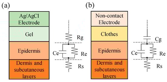 The skin-electrode interface models of (a) an Ag–AgCl electrode and (b) a noncontact dry electrode.