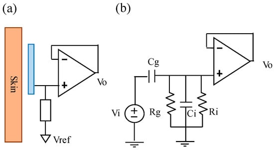 The electrode-skin interface models of conventional Ag/AgCl electrode and noncontact electrode are shown in Figure 1a,b. In general, conductive gel has to be applied in the conventional Ag/AgCl electrode to form a conductive layer between the electrode and skin and to reduce the impedance of the electrode-skin interface. Therefore, the equivalent circuit of the conductive gel layer can be simply viewed as a resistor. The skin layer can be viewed as a plate, and its equivalent circuit can be presented as a resistance and a capacitor in parallel. Therefore, the measurement of a biopotential by using the conventional Ag/AgCl electrode has to pass through these equivalent impedances, such as the skin layer, the conductive gel layer, and the metal electrode.