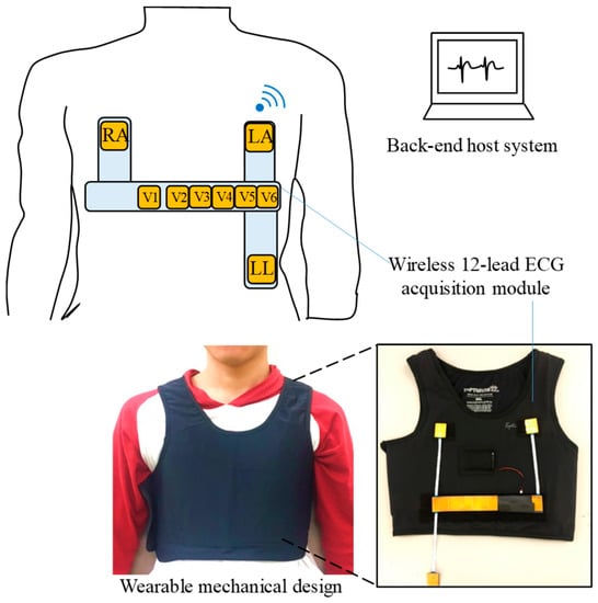 The system architecture and photograph of the proposed system is shown in Figure 3, and it mainly contains a wearable mechanical design, a wireless 12-lead ECG acquisition module, and a back-end host system. The wireless 12-lead ECG acquisition module is designed to measure ECG signals and can be embedded into the wearable mechanical design. The wearable mechanical design is designed to be worn easily in daily life and can provide a suitable pressure to avoid the sliding of the wireless 12-lead ECG acquisition module to acquire a good ECG signal quality. Finally, the acquired ECG signal will be transmitted to the back-end host system wirelessly via Bluetooth.