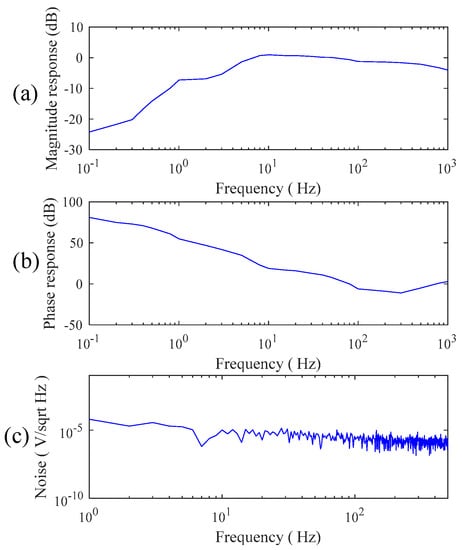 (a) The magnitude response, (b) phase response, and (c) referred noise spectrum of the proposed noncontact electrode.