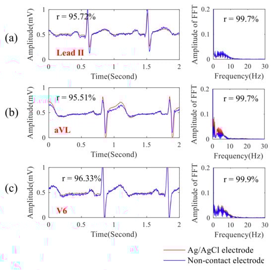 Next, the ECG signal quality obtained by the proposed noncontact electrode was compared with that of the conventional ECG electrode with conductive gels. In this experiment, the noncontact electrodes were placed across the chest through a thin T-shirt, and their locations were close to that of these conventional ECG electrodes. Figure 6a–c shows the comparisons between the lead II, aVL, and V6 ECG signals randomly selected from 12-lead ECG signals of different ECG electrodes and their spectra. Here, the ECG machine (PageWriter TC30, Philips, Amsterdam, Netherlands) with Ag/AgCl electrodes in Chi Mei Medical Center, Taiwan was used, and the function of the linear correlation coefficient in the Matlab software was used to estimate the difference between the ECG signal qualities obtained by different ECG electrodes. It showed that the correlation between ECG signals obtained by different electrodes was over 0.95 and that the correlation for the ECG spectra was over 0.99. The ECG signal quality obtained by the proposed noncontact electrodes across a T-shirt was exactly similar to that of the conventional ECG electrodes with conductive gels.
