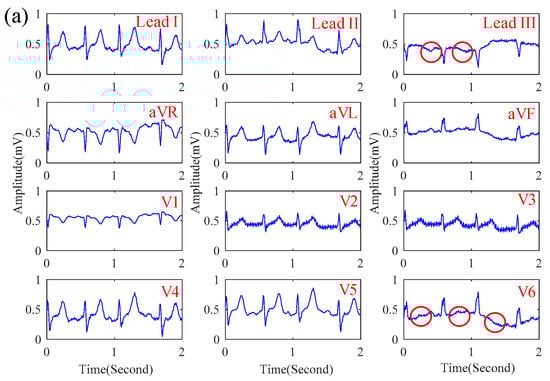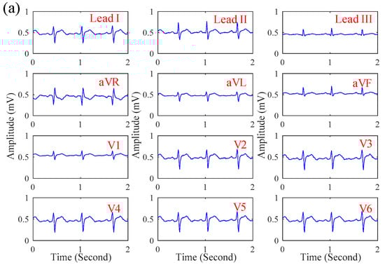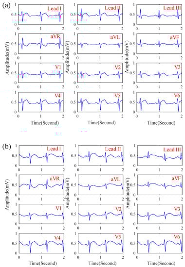 The 12-lead ECG signals obtained by the proposed system when (a) sitting and (b) walking.