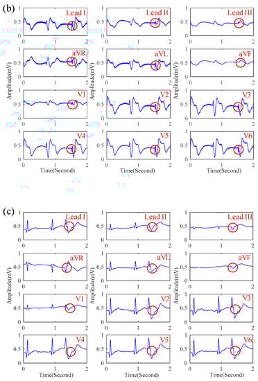 The standard 12-lead ECG system is used to collect 12 different ECG signals from different locations simultaneously to completely estimate the vector of electrocardiogram. The measurement of 12-lead ECG system can be simply classified into three parts, including three bipolar limb leads (LeadI, LeadII, and LeadIII), three unipolar limb leads (aVR, aVL, and aVF), and six unipolar chest leads (V1–V6). The measurement of LeadI–LeadIII uses three electrodes placed on the left arm (LA), the right arm (RA), and the left leg (LL) respectively. These unipolar limb leads can be represented as Equations (2)–(4).