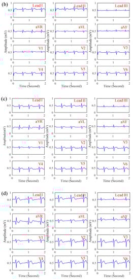 The 12-lead ECG signals obtained by the proposed system under different cloth conditions: (a) material: 100% cotton, thickness: 0.8 mm, dry; (b) material: 100% cotton, thickness: 1.4 mm, dry; (c) material: 80% cotton and 20% polyester, thickness: 0.8 mm, dry; (d) material: 100% cotton, thickness: 0.8 mm, sweating.