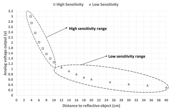 The IR-sensor sensitivity curve is given in Figure 1 according to SHARP specification manual. It represents the variation of the sensor output signal as a function of the detection distance variation (between 4 cm and 40 cm). The curve is almost the same for both white paper (reflectance ratio 90%) and gray paper (reflectance ratio 18%). We can distinguish two zones on the sensitivity curve—a steep variation zone and a flat one (Figure 1).