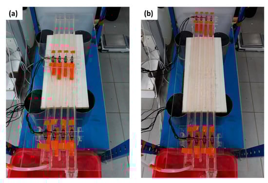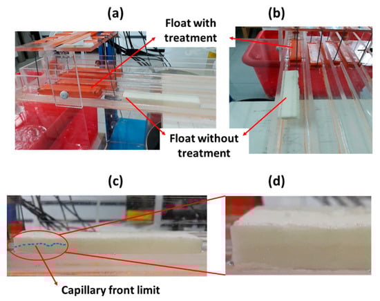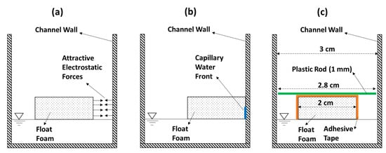 The float foam is an extruded polystyrene (XPS Foam). It has a parallelepiped form: 10 cm in length, 2 cm in width, and 1 cm in height. The float is lightweight (density around 35 kg/m3) and hydrophobic, but at the same time, it is attracted by electrostatic forces to the experimental channel walls (made of Polymethyl Methacrylate—PMMA extruded) as shown in Figure 3a. When the float foam touches the channel wall, a thin capillary water front develops at the float-wall interface (Figure 3b).