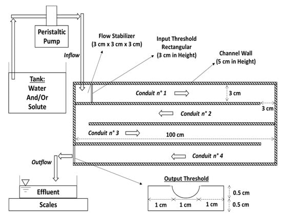 The experimental channel has a serpentine shape: it consists of four juxtaposed 100 cm conduits. The arrows show the flow direction: from water/solute tank, to peristaltic pump, to channel (input/inflow and output/outflow), and to effluent recipient.