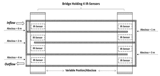 The bridges can be easily displaced or translated to any desirable abscissa (from 0 m to 4 m) across the channel. Due to the serpentine shape of the experimental channel, the four IR-sensors that are mounted on a bridge can deliver WL measurements for wide abscissa ranges—a minimum of 2 m abscissa range when the bridge is at the right hand side in Figure 6, and a maximum of 4 m abscissa range when the bridge is at the left hand side in Figure 6.
