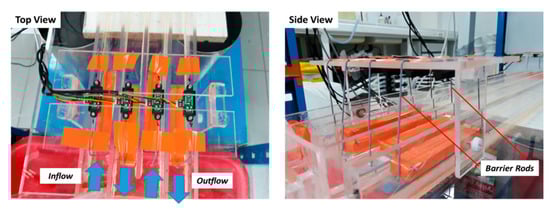Top and side views of a bridge holding four IR-sensors. The blue arrows show the direction of water flow in the experimental channel. On both sides of the bridge, barrier rods are installed to keep the float foams at a standing still position below the IR-Sensors.