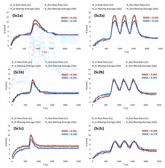 Experimental measurements of WL height at time interval of 1 s for the ensemble of the tested scenarios Sc1a, b, c and Sc2a, b, c. The shown data are the result of three replicates. Light red: WL height at abscissa 0 m (Hin)—raw data at 1 s time interval. Dark red: WL height at abscissa 0 m (Hin)—moving average over 10 s. Light blue: WL height at abscissa 4 m (Hout)—raw data at 1 s time interval. Dark Blue: WL height at abscissa 4 m (Hout)—moving average over 10 s. RMSE (mm) red and blue respectively: root mean squared error between raw data (1 s) and moving average (10 s) for Hin and Hout respectively.