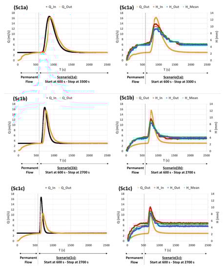 The results of Sc1 are shown in Figure 10. We see that the WL measurements (H (t) curves) at the input (abscissa 0 m), at the output (abscissa 4 m) as well as the mean WL (on the ensemble of the channel), follow the inflow variations (QIn (t) curves). In addition, when the QIn (t) curve changes from flat to sharp signal, the H (t) curves follow the same pattern. This shows that our WL measurement method is sensitive to the dispersion of flow events (with a precision of 1 mm). As to outflow measurements (QOut (t) curves), they also follow the pattern of QIn (t) curves. We note that for a flat inflow signal, the outflow signal is almost a reproduction of the inflow signal (with a small time delay). Whereas for a sharp inflow signal, the outflow signal is strongly damped, and its time delay is higher (Figure 10, Sc1c). This indicates that, although H (t) curves and QOut (t) curves follow the pattern of QIn (t) curves, there is however a difference in the response of H (t) to QIn (t) and that of QOut (t) to QIn (t). Therefore, the relation between H (t) and QOut (t) is not linear. This is well known in hydrological studies where the stage-discharge rating curves are used to study the relation QOut (Hout).