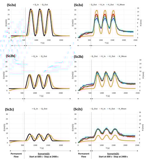 Before testing Sc2, we impose a permanent flow condition (Qp = 2 mL/s) in the channel during 10 min. Then Sc2 is tested for a duration of 30 min for the three variants (Sc2a, Sc2b, and Sc2c). Like Sc1, Sc2 is imposed on the channel input by the peristaltic pump by using the “pump control device”. Each variant of Sc2 was replicated three times and the mean of the replicates is shown in the results section.