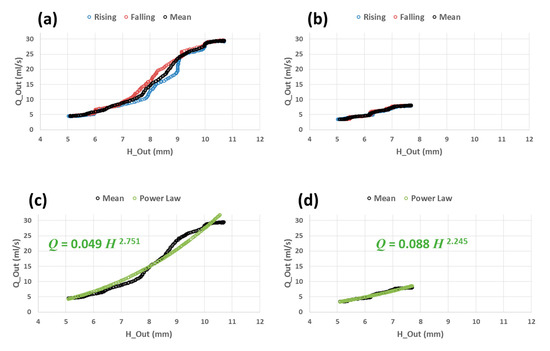 Stage-discharge rating curve relating the outflow QOut (mL/s) (estimated by scales measurements) to the WL at the output HOut (mm) (estimated by IR-Sensor measurement). (a) The rating curve is based on the central crest of the sine-squared function of Sc2a. (b) The rating curve is based on the central crest of the sine-squared function of Sc2c. Blue: rising WL. Red: falling WL. Black: mean of both rising and falling WL. (c) Theoretical adjustment (power law) of mean curve of (a). (d) Theoretical adjustment (power law) of mean curve of (b).