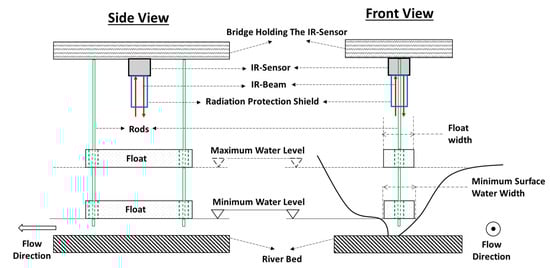 To adapt this setup to a channel cross section with irregular shape, the width of the float should be small enough to cover the range of minimum to maximum water level without touching the boundaries of the cross section. This condition would be guaranteed if the float width is set to the minimum surface water width corresponding to the minimum water level (or threshold) of the channel.