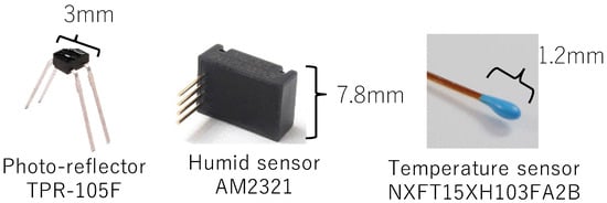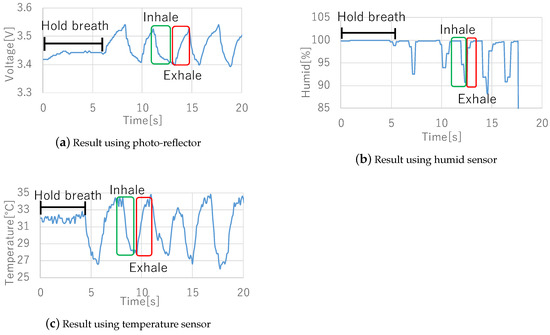We conducted pre-experiments to investigate the data from various sensors during breathing. In the pre-experiments, we collected data from the subject with a photo-reflector, temperature sensor, and humidity sensor attached to the nasal cavity. We selected these sensors because data from a photo-reflector would be affected by the shape change in breathing, data from a humidity sensor would be affected by the humidity difference between inhaling and exhaling, and data from a temperature sensor would be affected by the temperature difference between inhaling and exhaling.
