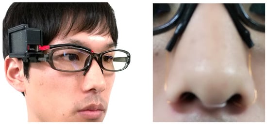 As the contexts can be gathered from the nose, breathing and nasal congestion are very important for knowing user behaviors and psychological states. Breathing is one of the primary vital signs. In addition, the breathing pattern changes with age, temperature, emotion, and so on. An adult breaths with an average frequency of 15 times per minute, the ratio of inhalation to exhalation is 2:3, and the air flow in one breath is approximately 500 mL, yet breathing patterns change from cardiac disease or cerebrovascular accidents [4,5]. Moreover, breathing patterns change with emotions [6], therefore, collecting data on daily breathing can lead to improving daily life from the perspective of one’s health or monitoring one’s emotions. Various studies propose methods for detecting breathing with wearable devices. For example, Haescher et al. presented a method of respiration detection by sensing changes in an accelerometer and a gyroscope from a smartwatch or a HMD [7,8,9]. This method can detect respiration only when the user’s posture remains stable. Some consumer devices such as Hexoskin can detect breathing by measuring breathing activities through changes in thorax volume [10], however, the accuracy is not so high since the recognition based on stretch sensors is strongly affected by user movements. RS-01 can detect breathing by measuring the breath flow with nasal cannula connected to a wristband device [11]. However, we cannot usually use this device in our daily activity.