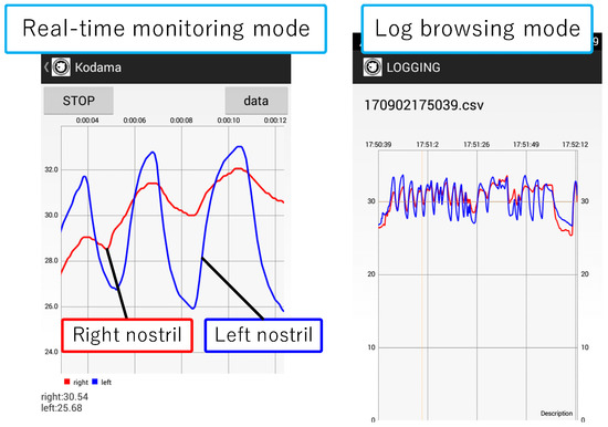 We implemented a prototype device and a logging and monitoring application. Figure 4 shows the implemented device, and Figure 5 shows a snapshot of a person wearing the device. Figure 4 and Figure 5 are taken from the previous published paper [2]. The device consists of a pair of glasses, a case made using a 3D printer, temperature sensors, a microcontroller, and a power supply. We attached the case to where the circuit is on the glasses frame, from which the conductor wire leads to the temperature sensors in the nasal cavity along the glasses frame. As the color of the conductor wire is close to the color of the skin, it does not stand out. Moreover, as we cover the conductor wire with foundation tape, the device can appear more natural. We apply a nose mask pit in the nose and attach sensors to it so that they are not out of place. The system consists of a smartphone (Huawei Ascend G6), a microcontroller (Red Bear Lab BLE Nano), and a temperature sensor (Murata Manufacturing NXFT15XH103FA2B). The sensor data is sent from the microcontroller to the smartphone with Bluetooth Low Energy. Figure 6 shows a screenshot of the implemented application. This application shows right and left nostril temperatures in real-time and records the data in the SD card. Moreover, by syncing the SD card folder with the PC local folder using the online storage service, Dropbox, the data that we collect with the Android application is sent to the computer. We acquire recognition results from the received data using WEKA [16], a data mining software application that was developed by the University of Waikato. We send the results to the smartphone storage again by Dropbox. In this manner, users can check recognition results on their smartphones.