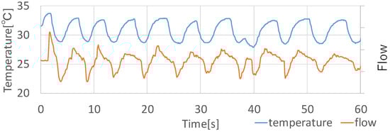 Table 1 shows the respiration rates in one minute for each condition. All respiration rates detected by the proposed device were the same as the ground truth. Although the experimental conditions were limited, we confirmed that the detectability for the respiration rate using the proposed device was correct. Figure 7 shows each data measured by the flow monitoring device and the proposed device when sitting. In the comparison between the two graphs, their waveforms had a subtle difference. The temperature data graph had a small change at approximately 40 s, while the flow data graphs had a similar waveform as other points’ them. The waveforms of the temperature data graph at around 50 and 60 s were the average waveform, while the changes in the waveforms of the flow data graph were relatively small. Although the number of participants is one, the temperature changes by breathing, in principle, must be the same as other people since the changes in the waveforms depend on only breathing. Although the data of the proposed device is somewhat different from that of the flow monitoring device, the proposed device can adequately detect the respiration rates.