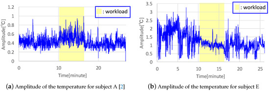 We recruited five subjects for the experiments. Figure 8 shows the amplitude of the temperature for two subjects. Figure 8a is taken from the previous published paper [2]. We acquired the amplitude by calculating a maximum value among absolute values of the difference between each sample of 60 samples before and after taking a sample and an average of the 60 samples. In Figure 8, the amplitude of the temperature in the nostrils is for the congested side. The workload area in this figure is filled with yellow, showing that the amplitude for subject A increased, as shown in Figure 8a. However, only two among five subjects showed this tendency toward higher temperature amplitude during the workload experiment, while other subjects exhibited a tendency toward lower amplitudes during workload, as shown in Figure 8b. This indicates that they breathed shallowly and the airflow decreased, as indicated by the lower amplitudes of both right and left nostrils in subject E. As another change in workload, the respiration rate can be evaluated. The respiration rate of all subjects increased during the workload experiments, which affected the feature value of the number of crosses between the signal mean and the raw signal. Table 2 shows precision, recall, and recognition rate for each participant and the averages for all participants. From the above, the recognition rate for all subjects was over 90%. Table 2 is taken from the previous published paper [2]. Although the recognition accuracy rate was high, the classification result has a bias and the experiment result was not replicable. Therefore, we need to collect more data in this experiment and regenerate and evaluate the classification model in order to implement an actual application.