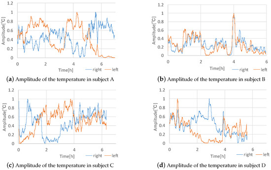 We investigated whether we could recognize the nasal cycle from raw temperature data. We recruited four participants. They wore the prototype device for from six to seven hours and carried an Android smartphone for collecting the data. We did not restrict their activities during experiments except to prohibit them from lying down because lateral recumbency causes nasal congestion in the nasal downside [17]. After we calculated the amplitude of temperature using the same method as the workload recognition experiments, we processed the data to compare the right and left data. First, we averaged the data in 300 samples. Next, we normalized the right and left data so that the maximum value was one and the minimum value was zero to correct for the amplitude differences between the right and left data. Figure 9 shows the temperature amplitudes after being processed for the four subjects. In the experiment of subject D, the battery of the prototype device died and the measurement stopped. As Figure 9a shows, we can see a cycle in subject A clearly. Subject A’s cycle is approximately 100 min, where one side’s value is greater than the other side’s value. Regarding the other subjects, we cannot see a clear cycle in the graphs, however, we can see an alternation of the side whose amplitude is greater. For example, in the result of subject C the amplitude of the right nostril was greater from zero hours to approximately one and one-half hours, however, after that time, the amplitude of the left side was greater. Similarly, in the result of subject B the amplitude of the left nostril was greater from zero hours to approximately two hours, however, afterward, the amplitude of the right side was greater. In the result of subject D, although we can see that the amplitude of the right nostril was much greater than the amplitude of the left nostril, we cannot see a cycle or an alternation of the side with greater amplitude. From the above, although the system can detect the nasal cycle, the results of the experiment were different between subjects and we need to collect more data for further analysis. If we can determine a clear relationship between the nasal cycle and other biological information, we can apply the proposed system to the medical field or perhaps provide a novel lifelog service. In this long-term experiment, the temperature sensors were wet by nasal mucus, yet the sensor data did not appear to be significantly affected by this. However, we need to confirm how much nasal mucus affects the sensor data. We received feedback that the device interferes when a user wishes to blow their nose. Accordingly, we need to improve the design of the device.