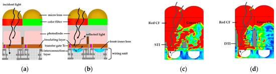 Contrastingly, the reflected light from the front-inner lens could be absorbed in the next photodiode as the crosstalk. The beam profile of the power flux density in the test simulation of the front-inner lens with air shows this phenomenon in Figure 1c,d. To show crosstalk well, the light was incident at 20°. The wavelength of the incident light was 650 nm. Simply put, the red region in the beam profile shows the transmitted light, which could be absorbed in the photodiode. In this work, the reduction of the crosstalk in the shallow trench isolation (STI) and DTI structures was compared as shown in Figure 1c,d. Figure 1c shows the light caused mostly by the reflection of the front-inner lens because the STI cannot block the crosstalk. On the contrary, the DTI can block the reflected light, as shown in Figure 1d. However, the DTI reduced the sensitivity due to the decrease in absorption because the area of the photodiode shrank, especially in the small pixel pitch. We simulate and compare STI and DTI in the following section.