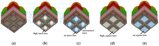 Simulated 3D pixel structures at the 1.0 μm pixel depth: (a) Typical structure, (b) front-inner lens with MgF2, (c) front-inner lens with air, (d) square front-inner lens with MgF2, and (e) square front-inner lens with air.