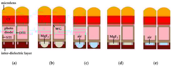 Cross-section of the simulated pixel structures in the 1.0 μm pixel depth. The left pixel of all cross-sections had STI, and the right pixel had DTI and WG: (a) Typical structure, (b) front-inner lens with MgF2, (c) front-inner lens with air, (d) square front-inner lens with MgF2, and (e) square front-inner lens with air.