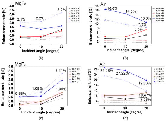 Finally, the absorbed photon density in the photodiode was simulated for investigation of the sensitivity as the pixel performance. Figure 4 shows the enhancement rate of the absorbed photon density between the typical and the suggested structures with respect to angular response. The enhancement rate was obtained by dividing the absorbed photon density of the typical and suggested structures. The simulated results according to the depth of the photodiode are represented by a blue triangle symbol for 1.0 μm, a red circle symbol for 2.0 μm, and a black square symbol for 3.0 μm. The simulation results of the pixels with STI are shown by a dotted line, and DTI are shown by a solid line. The simulation results of the enhancement rate are shown at the incident angles of 0°, 10°, and 20°. Figure 4a,b shows the enhancement rate in the case of the front-inner lens with MgF2 and air. Figure 4c,d shows the enhancement rate in the case of the square-shaped front-inner lens with MgF2 and air. From the simulation results, most pixels with the front-inner lens showed improvement in absorbed photon intensity. The 3.0 and 2.0 μm pixel depths did not exhibit such a large enhancement because the incident light was at 650 nm wavelength, which was absorbed completely at the 2.0 μm pixel depth. Therefore, the enhancement was greatest at 1.0 μm pixel depth. The enhancement rate in the case of air was larger than MgF2 because air, which has a lower refractive index and greater difference with the inter-dielectric layer, reflected the incident light more than the MgF2. The enhancement rate of the 1.0 μm pixel depth with DTI was the largest in the air front-inner lens structure. The reason for this was that the crosstalk was reduced by DTI, and the absorption was increased to the photodiode. As a result, the absorbed photon density as the sensitivity, compared between the typical and the suggested pixels, was improved to a maximum of 7.27%, 10.47%, and 29.28% at 3.0, 2.0, and 1.0 μm pixel depths, respectively.