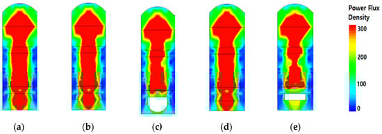 The beam profiles of the simulated power flux density. The incident light was a 650 nm wavelength at 0°. The mesh size was 5nm. The pixel depth was 1.0 μm with STI: (a) typical structure, (b) front-inner lens with MgF2, (c) front-inner lens with air, (d) square type of front-inner lens with MgF2 square, and (e) square type of the front-inner lens with air.