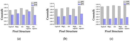The crosstalk by the reflected light from the front-inner lens or the transmitted light from the next pixel can be reduced by the DTI, as mentioned in the Section 2. The simulation results of crosstalk are shown in Figure 6. Crosstalk is a sum of the absorbed light density of green and blue pixels when the incident light is 650 nm wavelength. We simulated the typical structure without the front-inner lens and the suggested structures with the front-inner lens of MgF2 or Air. The simulated pixel depth was 1.0 μm. Crosstalk is also investigated at the incident angles of 0°, 10°, and 20°. From the simulation results, crosstalk in the STI structure increased by inserting the front-inner lens. The reflected light was absorbed back into the pixel or penetrated into the next pixel to form a crosstalk. Also, the front-inner lens with air had more crosstalk because of its larger reflection. Therefore, the crosstalk should be reduced by DTI and the light can be absorbed into the pixel for high sensitivity. In Figure 6, the black diagonal stripe patterned bar indicated crosstalk without a DTI structure, and the blue check patterned bar indicates crosstalk with a DTI structure. For all of the structures, crosstalk can be enhanced by inserting DTI. As a result, crosstalk by DTI is reduced by up to 34%, 49%, and 68% at 0°, 10° and 20° incident angles, respectively.