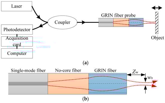 The schematic diagram of the Fabry–Perot (F–P) fiber interferometer based on the ultra-small gradient-index (GRIN) fiber probe: (a) the schematic diagram of the interferometer system; (b) the schematic diagram of the ultra-small GRIN fiber probe in the interferometer system.