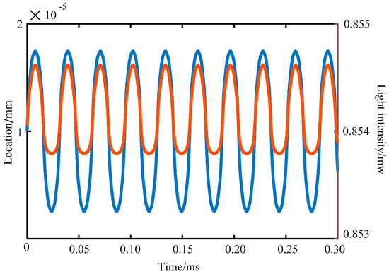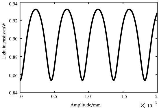 According to Equation (6), when the reflection coefficient of the reflection surface, the wavelength of the incident light, and the light intensity are all determined, the interference intensity of the interferometer output is only related to the amplitude A and the frequency ω of the vibration signal at the same time. The vibration signal frequency ω is 200 Hz, the incident light intensity I0 is 1 mW, the wavelength λ is 1550 nm, Q1 is 0.94, Q2 is 0.076, Q3 is 1.036, and n is 5. At the same time, the output signal intensity of the interferometer varies with the amplitude of the vibration signal as shown in Figure 2. The signal intensity of the interferometer output varies with the amplitude of the vibration signal in an approximate cosine form. When the amplitude A of the vibration signal is fixed at 20 nm, the vibration signal (blue curve) and the output intensity of the interferometer (brown curve) change with time as shown in Figure 3. The vertical coordinate of the vibration signal curve is the vibration position, and its unit is in millimeters. The vertical coordinate of the output signal of the interferometer is light intensity, and its unit is in megawatts. As shown in Figure 3, the two curves have the same frequency. Therefore, the measurement of the amplitude and the frequency of the object to be measured can be converted into the measurement of the F–P interferometer’s output signal strength and frequency.