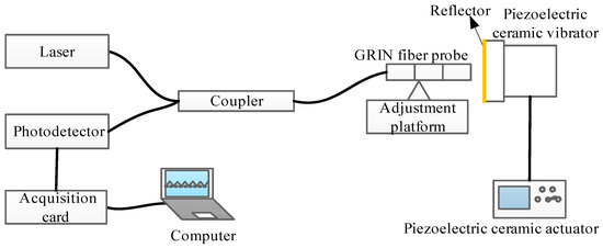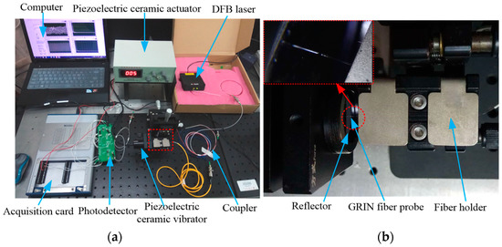 Based on the working principle of the F–P interferometer and the structural model of the miniaturized fiber interferometer, the experimental system of the F–P fiber interferometer shown in Figure 4 was constructed. Figure 5a is the corresponding picture of the experimental system. Figure 5b is a close-up view of the details circled in the red rectangle in Figure 5a. The system consists of a distributed feedback laser (DFB laser source), a 3 dB fiber coupler, a detection signal arm, a probe position adjustment platform, a piezoelectric ceramic vibration device, a photoelectric detection and signal processing unit, an acquisition card, and a computer. The main working principle is that the light emitted by the DFB source is split by the coupler and transmitted to the GRIN fiber probe, and is then incident perpendicularly to the mirror attached to the piezoelectric ceramic vibrator with a mirror through the GRIN fiber probe. Between the end surface of the fiber probe and mirror, after multiple reflections and transmissions, the reflected light is coupled into the GRIN fiber probe to generate interference. The interference signal with the vibration information is converted from the photodetector to an electric signal. The acquisition card collects the signal and transmits it to the computer.