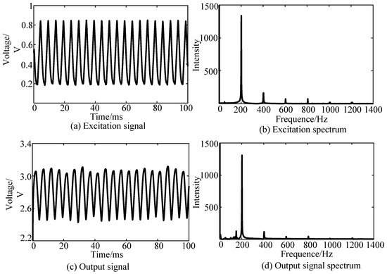 Time-domain and frequency-domain waveforms of the experimental signals at 200 Hz. They are: (a) excitation signal; (b) excitation spectrum; (c) output signal; (d) output signal spectrum.