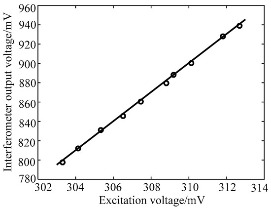 It is known that the displacement and vibration amplitude of the piezoelectric ceramic vibrator are related to the excitation signal voltage of the piezoelectric ceramic driver. When the excitation signal frequency is fixed, the voltage variation of the excitation signal causes displacement or amplitude variation of the piezoelectric ceramic vibrator. The frequency of the excitation signal is 200 Hz. In the linear region of the interferometer, the output voltage of the F–P interferometer changes as the excitation signal voltage changes. Figure 7 shows the relationship between the output voltage of the F–P interferometer and the excitation signal voltage. The circled points represent the interferometer output voltage of the experimental acquisition, and the line is the curve of the variation relationship between two voltages. The fitting equation can be expressed as: